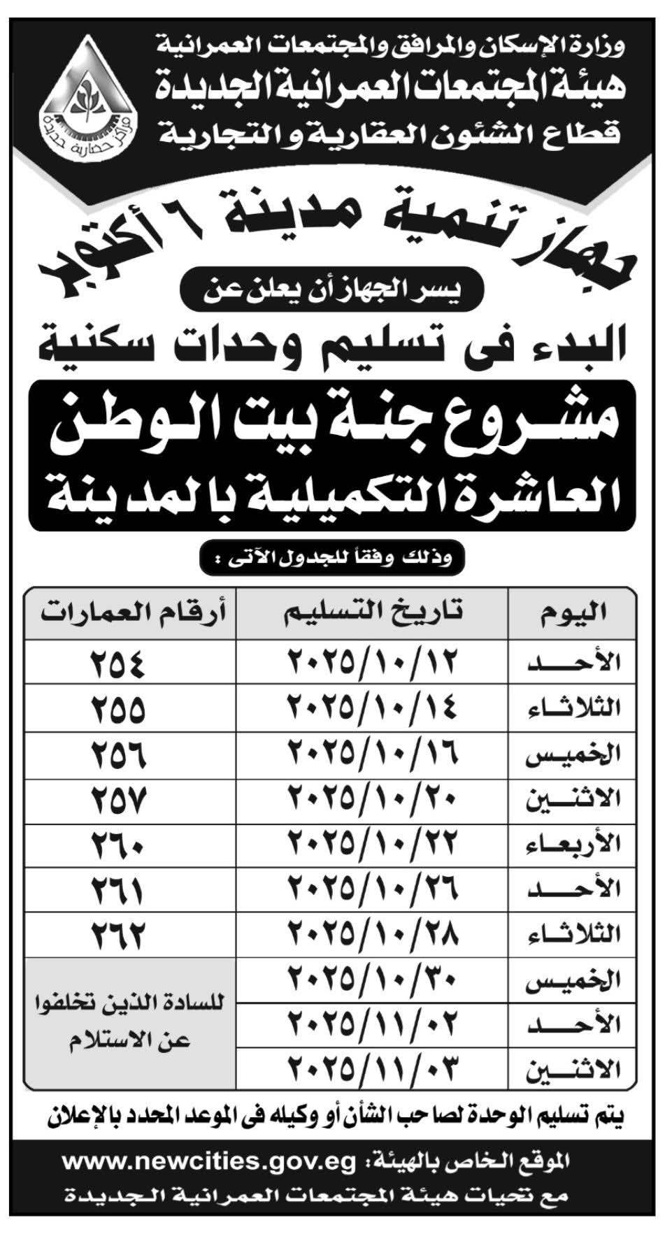 أعلن جهاز تنمية مدينة 6 أكتوبر عن بدء تسليم وحدات سكنية بمشروع جنة بيت الوطن – المرحلة التكميلية، وذلك اعتبارًا من الأحد 12 أكتوبر 2025، وفق جدول زمني محدد لأرقام العمارات.