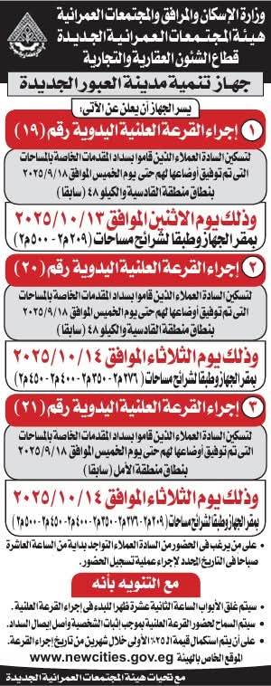 أعلن جهاز تنمية مدينة العبور الجديدة عن إجراء القرعة العلنية للأراضي أرقام 19 20 21 تباعا طبقا للمو