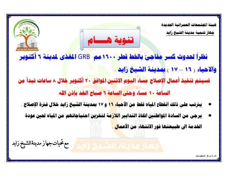 أعلن جهاز تنمية مدينة الشيخ زايد عن انقطاع المياه عن الأحياء (16 و17) بالمدينة، مساء اليوم الإثنين، ولمدة 8 ساعات تبدأ من الساعة 10 مساءً حتى السادسة صباح غد الثلاثاء، وذلك نتيجة كسر مفاجئ بالخط المغذي GRB قطر 1200 مم لمدينة 6 أكتوبر والأحياء المجاورة.