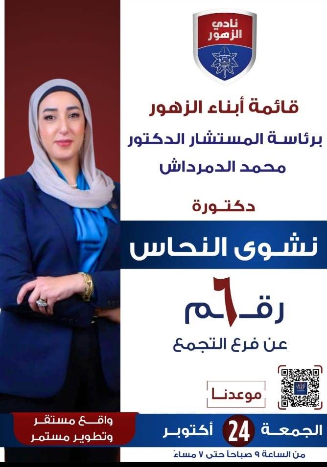 وتخوض الدكتورة نشوى النحاس الانتخابات على مقعد عضوية مجلس إدارة نادي الزهور الرياضي ضمن قائمة المستشار الدكتور محمد الدمرداش "أبناء الزهور"، التي تضم مجموعة من الكفاءات والخبرات الإدارية والرياضية.