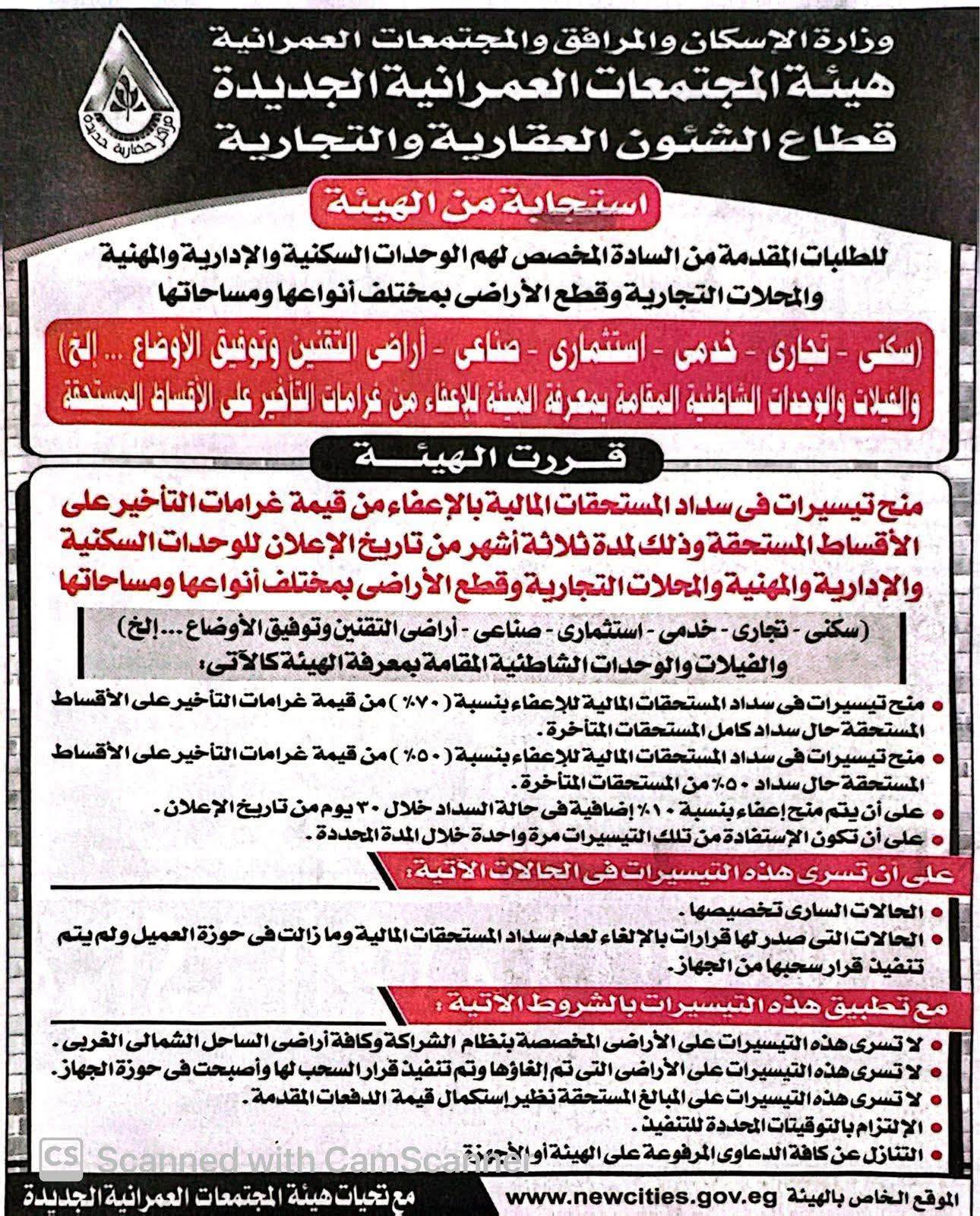 أعلنت هيئة المجتمعات العمرانية الجديدة بوزارة الإسكان والمرافق والمجتمعات العمرانية، عن منح تيسيرات جديدة في سداد المستحقات المالية المقررة على الوحدات السكنية والإدارية والمهنية والتجارية، وقطع الأراضي بمختلف أنواعها ومساحاتها، وذلك في المدن الجديدة.