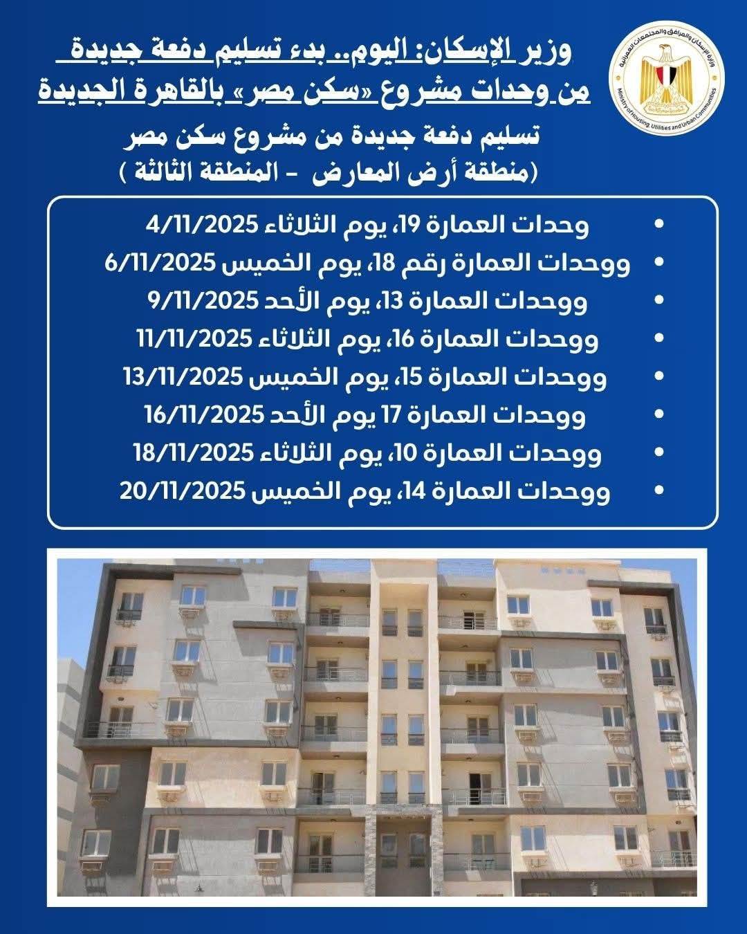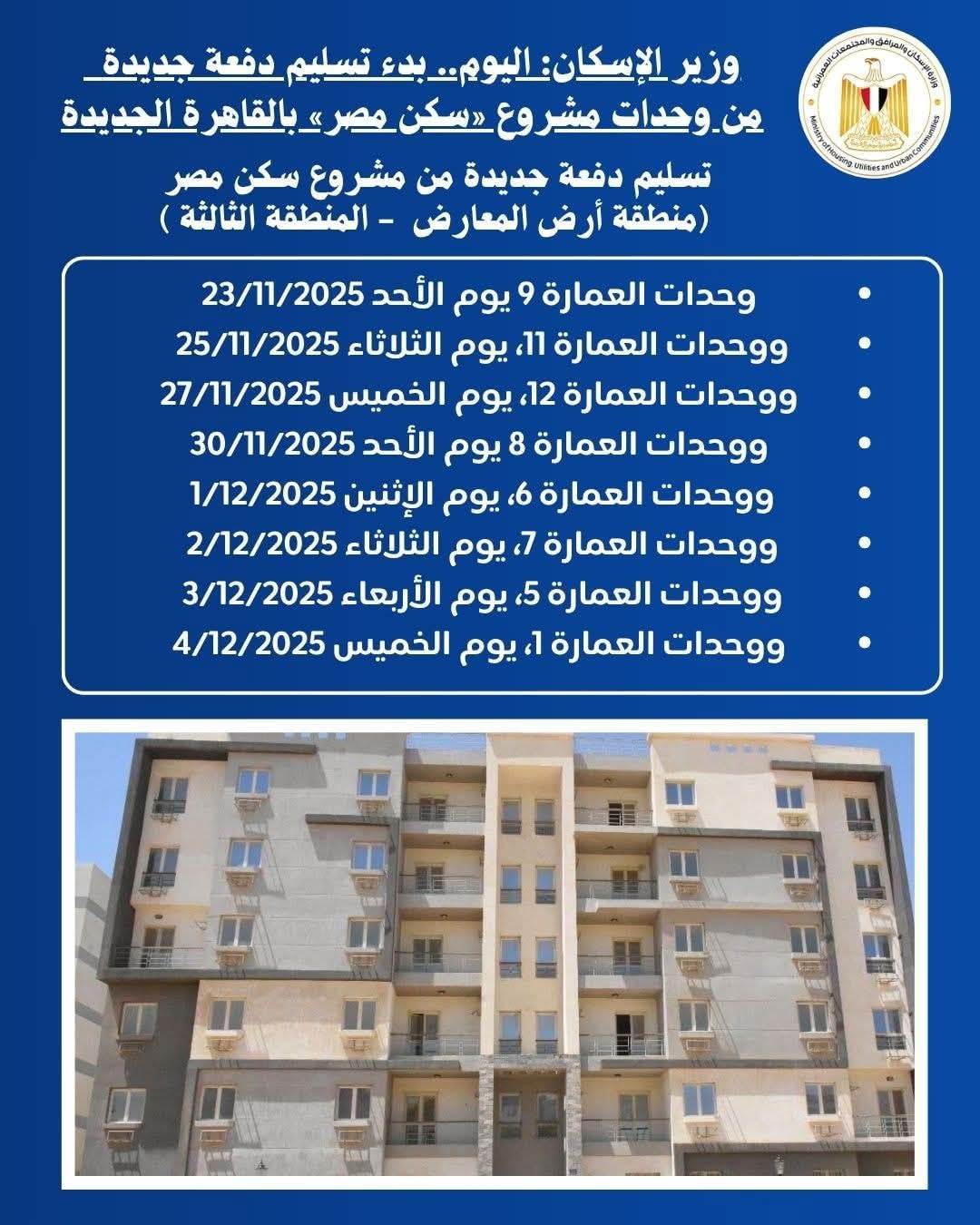 أعلن المهندس شريف الشربيني، وزير الإسكان والمرافق والمجتمعات العمرانية، عن تسليم دفعة جديدة من وحدات مشروع «سكن مصر» بمنطقة أرض المعارض – المنطقة الثالثة بمدينة القاهرة الجديدة، اعتباراً من اليوم الثلاثاء وحتى يوم الثلاثاء 9/12/2025، وفقاً للمواعيد المقررة.