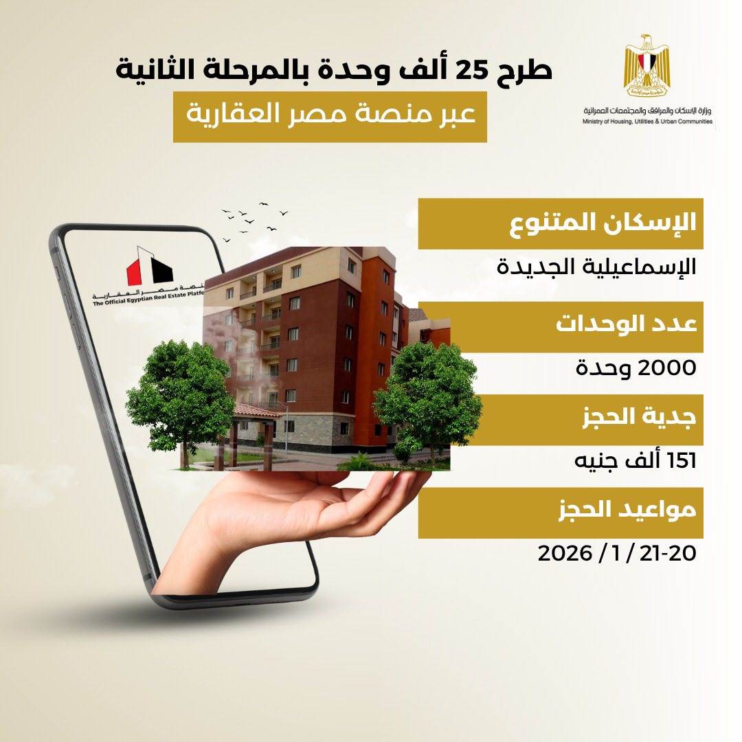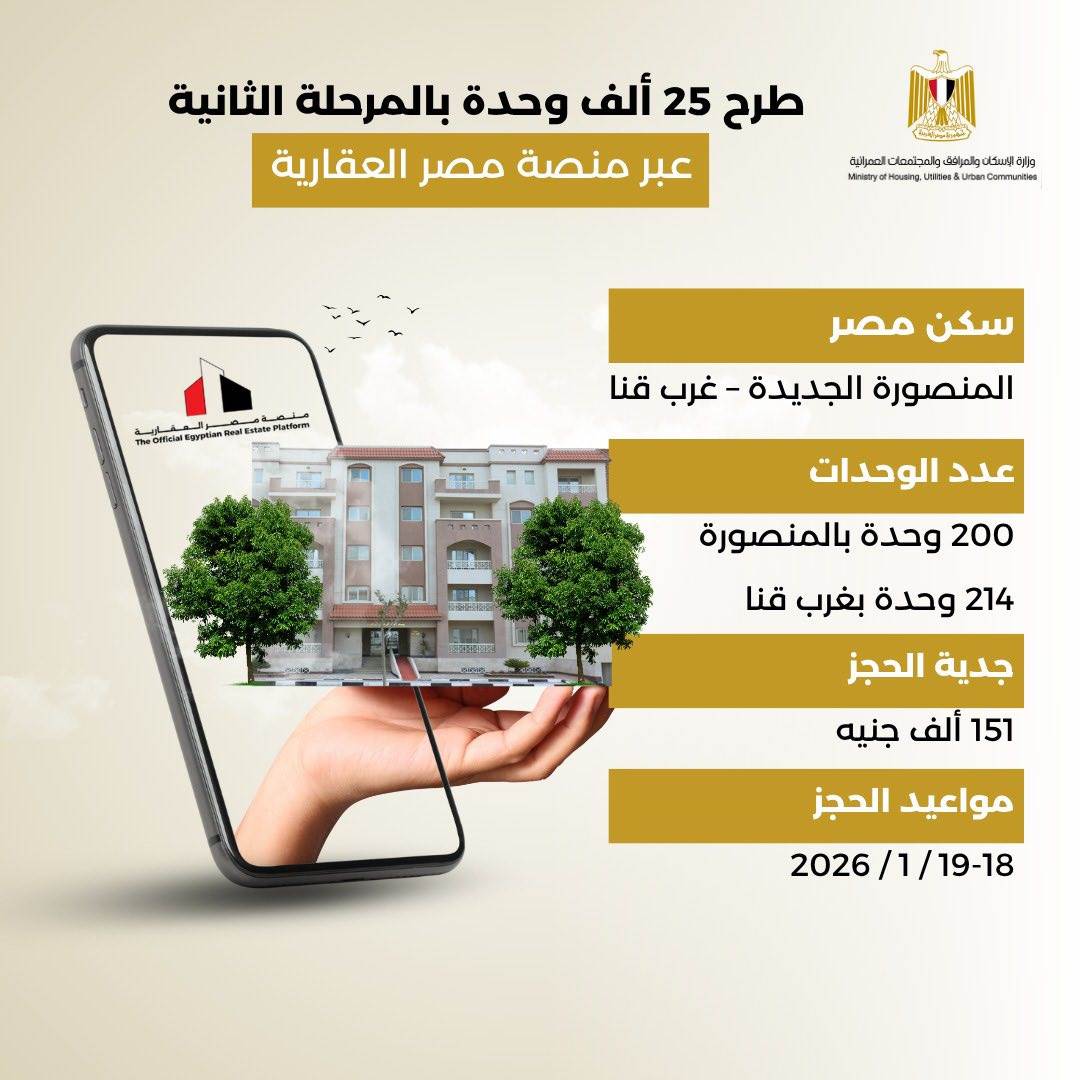أعلنت وزارة الإسكان، عبر إنفوجراف، تفاصيل طرح 25,012 وحدة سكنية ضمن المرحلة الثانية من أكبر طروحاتها السكنية، موضحة بدء التسجيل والحجز اعتبارًا من الأحد المقبل 16 نوفمبر 2025 عبر منصة «مصر العقارية»