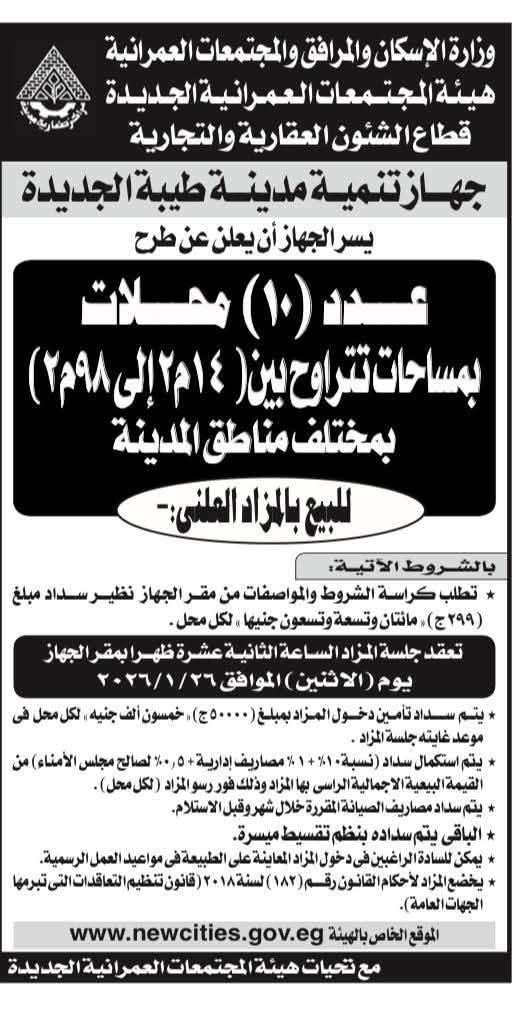 أعلن جهاز تنمية مدينة طيبة الجديدة، التابع لهيئة المجتمعات العمرانية الجديدة بوزارة الإسكان، عن طرح 10 محال تجارية بمساحات تتراوح بين 14 م² و298 م² بمختلف مناطق المدينة، وذلك للبيع بالمزاد العلني.