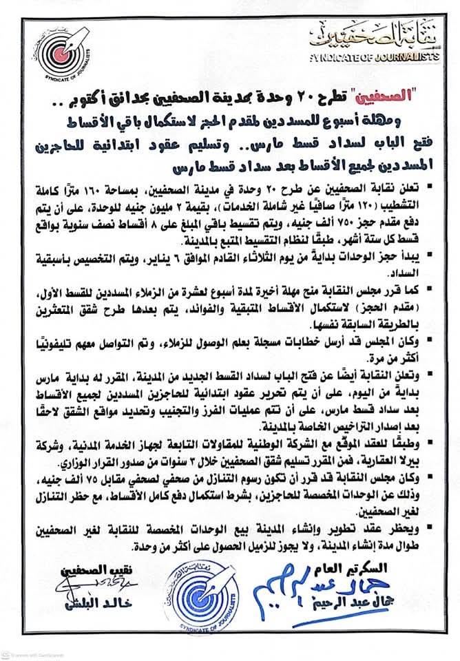 كما أعلنت النقابة فتح الباب لسداد قسط شهر مارس اعتبارًا من اليوم، على أن يتم تحرير العقود الابتدائية للحاجزين المسددين لكافة الأقساط عقب سداد قسط مارس، على أن تتم أعمال الفرز والتجنيب وتحديد مواقع الوحدات لاحقًا بعد صدور التراخيص الخاصة بالمدينة.