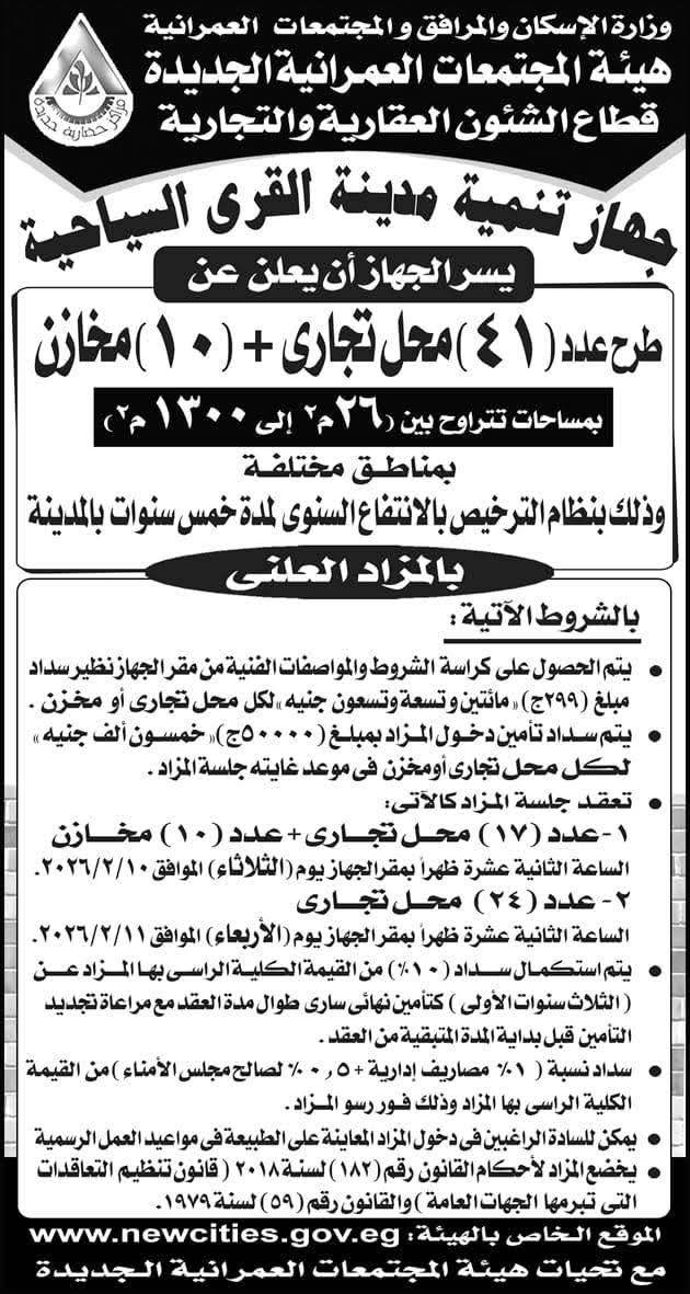 أعلن جهاز تنمية مدينة القرى السياحية، عن طرح عدد من المحال التجارية والمخازن للبيع بالمزاد العلني، وذلك في إطار دعم الأنشطة التجارية والخدمية داخل المدينة.