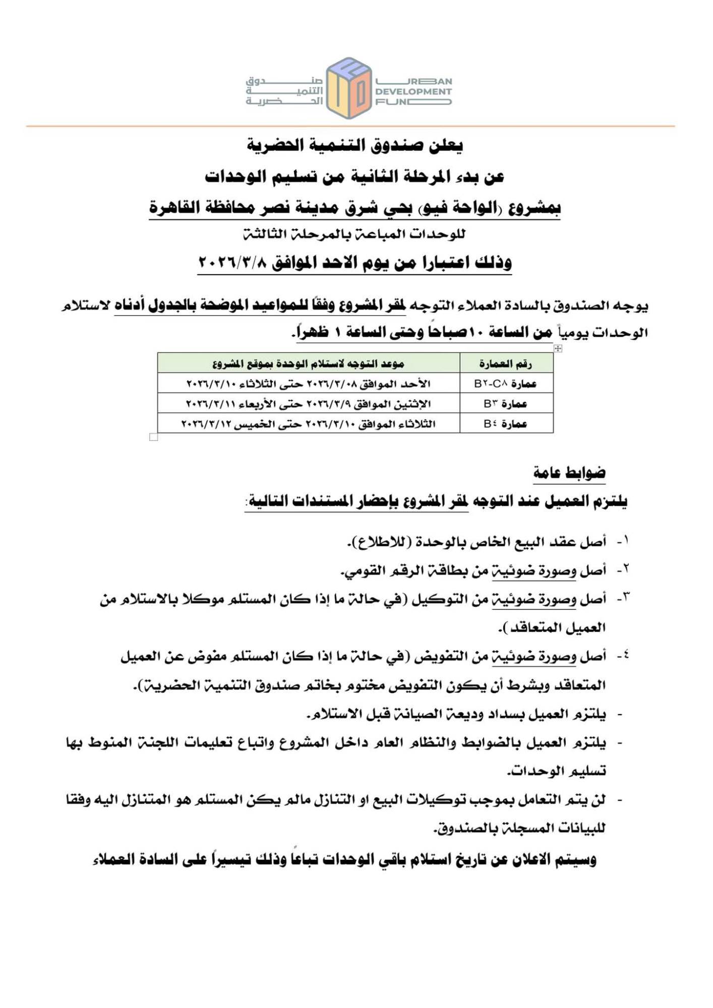 أعلن صندوق التنمية الحضرية عن بدء تسليم المرحلة الثانية من الوحدات المباعة بالمرحلة الثالثة بمشروع الواحة فيو