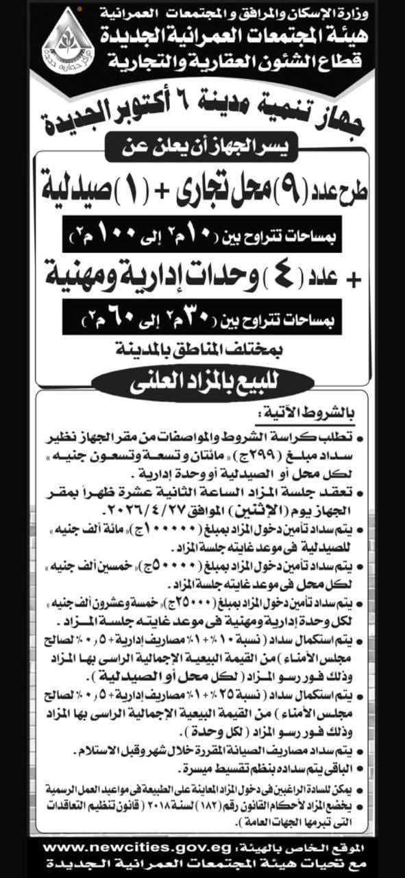 أعلن جهاز تنمية مدينة 6 أكتوبر الجديدة،عن طرح عدد من الوحدات التجارية والإدارية والمهنية للبيع بالمزاد العلني، وذلك في إطار خطة تعظيم الاستفادة من الأصول ودعم الأنشطة الاستثمارية والخدمية بالمدينة.