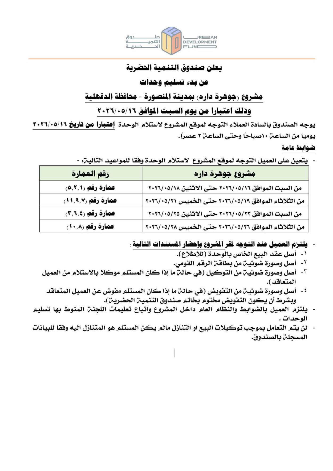 أعلن صندوق التنمية الحضرية عن بدء تسليم وحدات مشروع «جوهرة داره» بمدينة المنصورة بمحافظة الدقهلية، اعتبارًا من يوم السبت الموافق 16 مايو 2026، وفق جدول زمني محدد لكل عمارة.