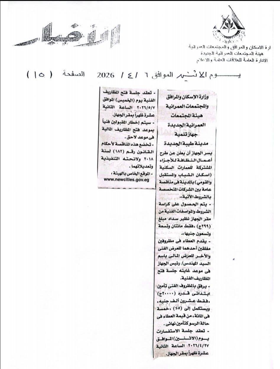 وأشار الإعلان إلى أن جلسة فتح المظاريف الفنية ستُعقد يوم الخميس الموافق 7 مايو 2026 في تمام الساعة الثانية عشرة ظهرًا بمقر الجهاز، على أن يتم إخطار الشركات المقبولة فنيًا بموعد فتح المظاريف المالية لاحقًا.