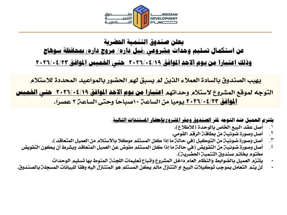 وأوضح الصندوق أنه يتعين على العملاء الذين لم يسبق لهم الحضور في المواعيد المحددة للاستلام، التوجه إلى موقع المشروع لاستلام وحداتهم خلال الفترة المشار إليها، يوميًا من الساعة 10 صباحًا وحتى الساعة 3 عصرًا.