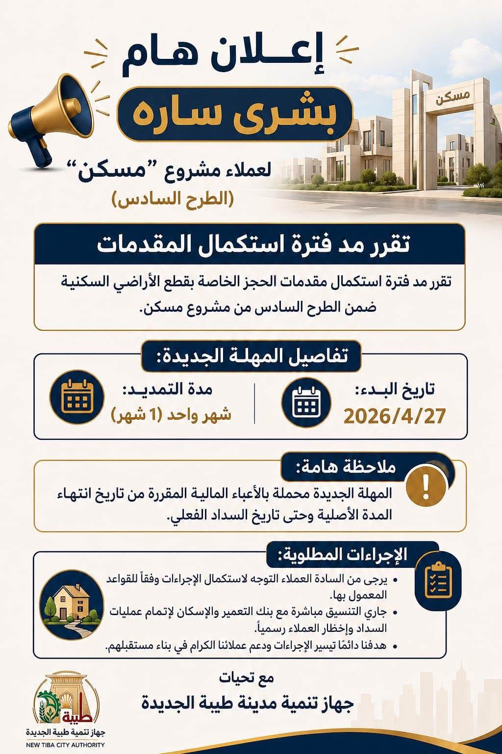 أعلن جهاز تنمية مدينة طيبة الجديدة عن مد فترة استكمال مقدمات الحجز الخاصة بقطع الأراضي السكنية ضمن الطرح السادس من مشروع «مسكن»، وذلك في إطار التيسير على العملاء واستيعاب الطلب المتزايد.